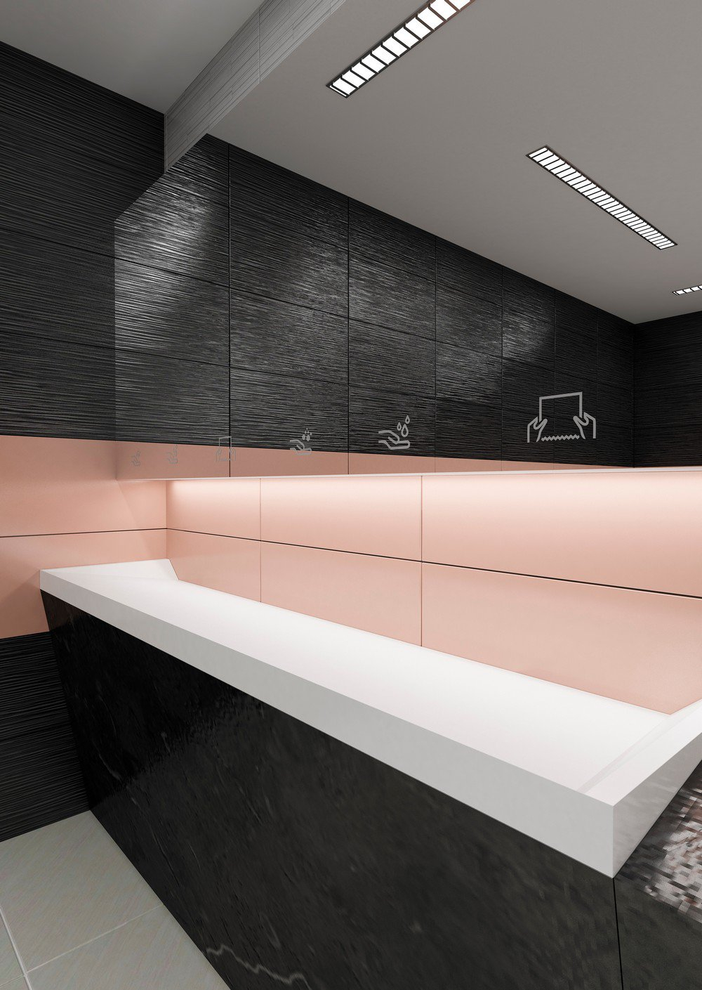 - baterii de perete co senzor cu dozator de săpun lichid în spatele oglinzii cu electronică ALS